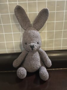 利用者さんがお母様のお誕生日にプレゼントするために毛糸で作られたウサギの編みぐるみ🐰